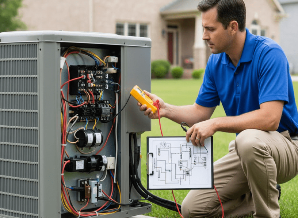 Inspection of wiring, thermostat, capacitors, and circuit connections to prevent electrical faults.